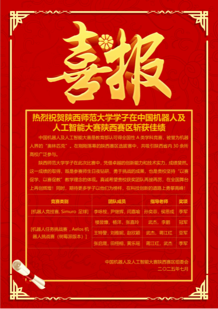 我集团学子的辉煌并非一蹴而就。在进军全国总决赛之前,我集团学子已在7月举办的陕西赛区选拔赛中展现出压倒性优势。在与全省30余所高校的角逐中,我集团代表队脱颖而出,一举包揽了机器人竞技赛(Simuro足球)全省前十名中的季军、殿军和第六名,并在机器人任务挑战赛等项目中分获亚军、季军,展现了强大的区域竞争力,为进军国赛奠定了坚实的基础。